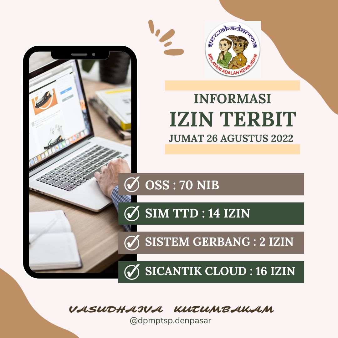 Informasi jumlah izin terbit harian DPMPTSP Kota Denpasar hari Jumat tanggal 26 Agustus 2022