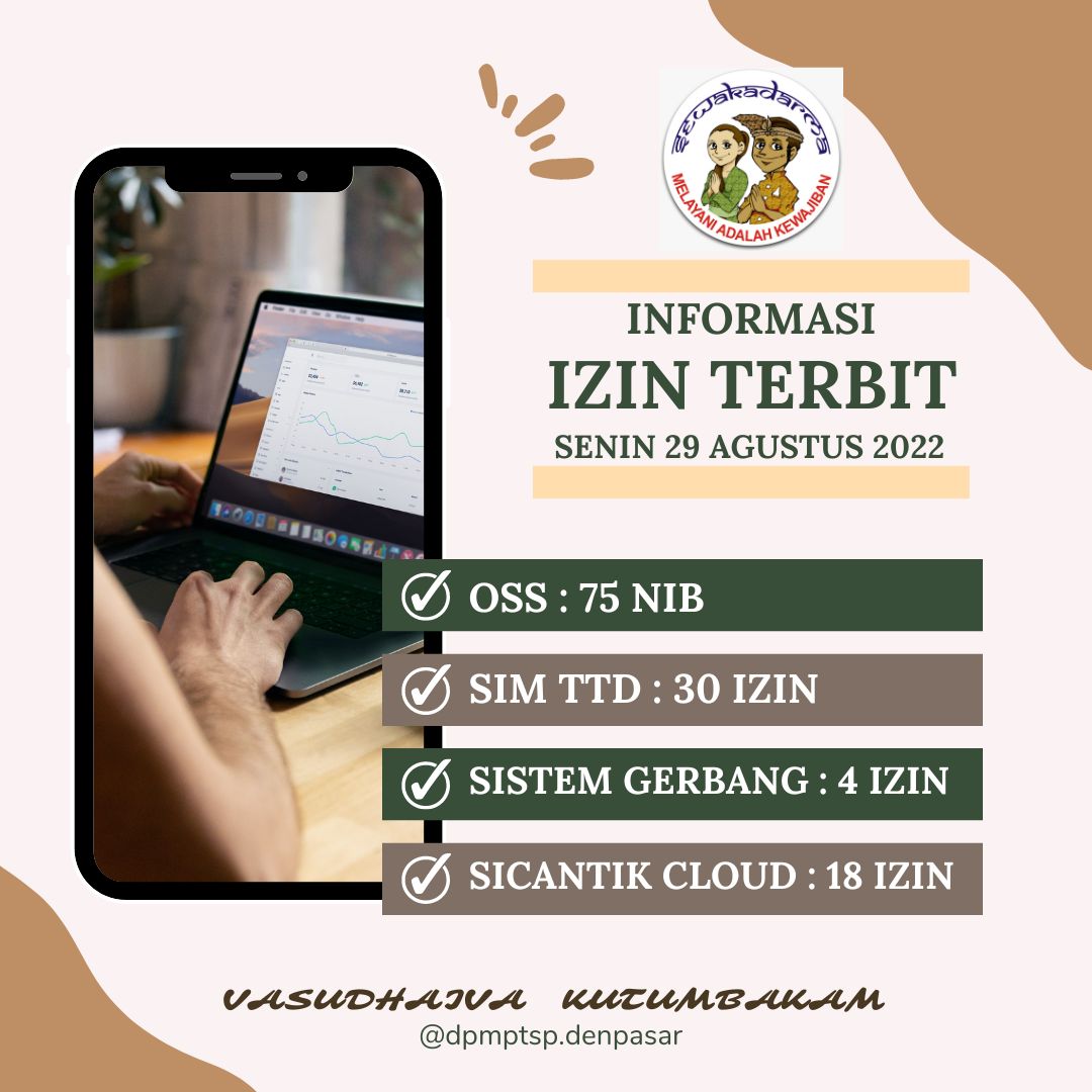 Informasi lzin terbit harian DPMPTSP Kota Denpasar pada hari Senin tanggal 29 Agustus 2022